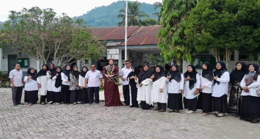 Selesai upacara bendera pada peringatan HARDIKNAS kepala sekolah dan guru guru berfhoto bersama dengan berbagai pakaian adat Nusantara